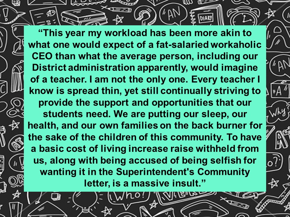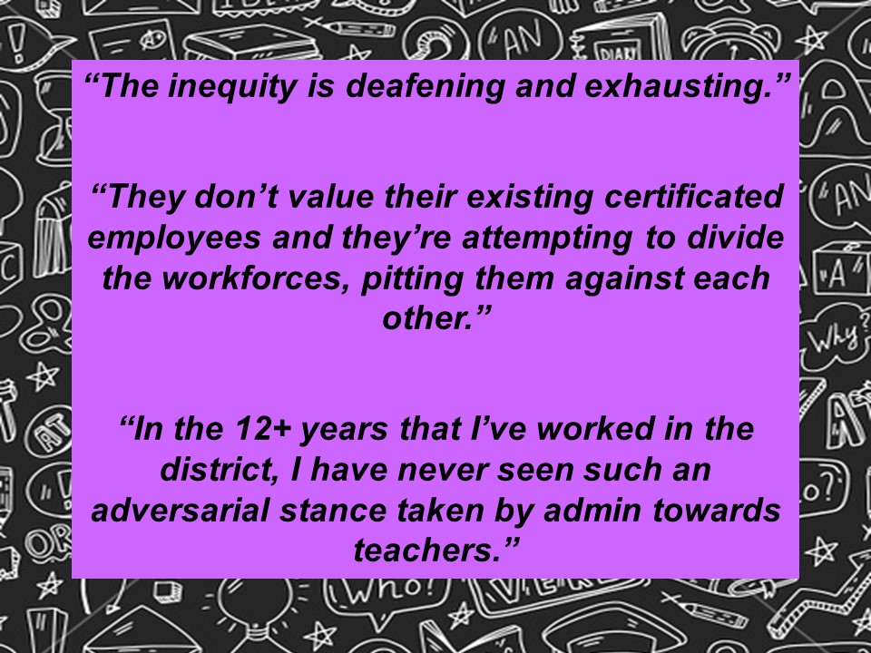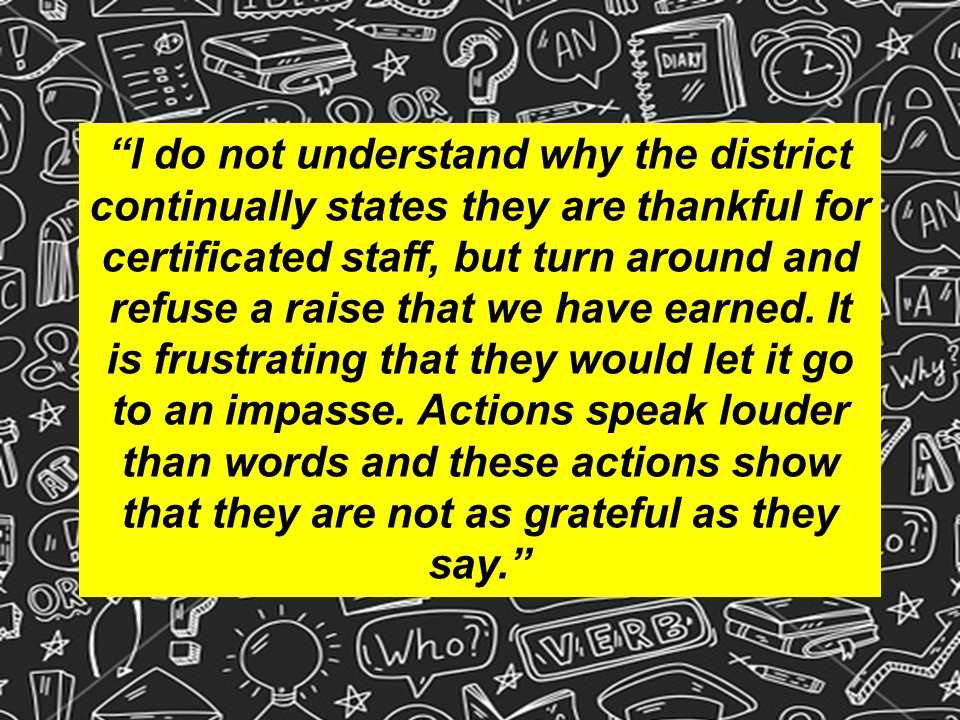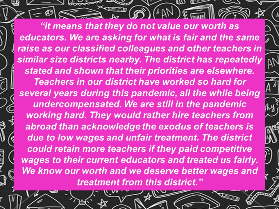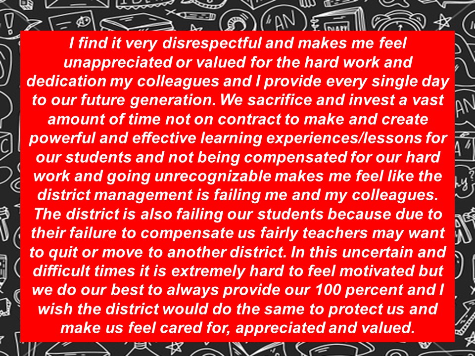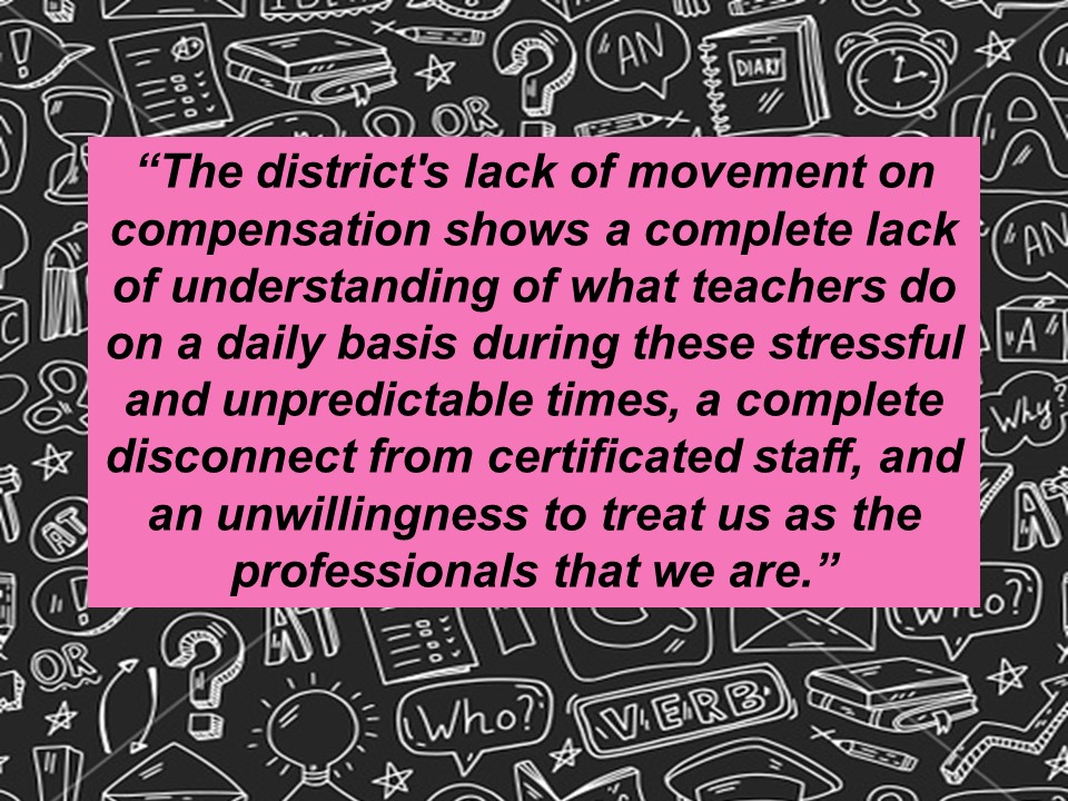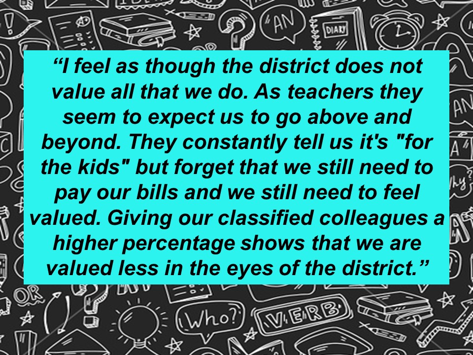 Although we filed for impasse yesterday, we remained committed to meet today with the District’s team, in the event that they had any additional new offers they wanted to present to us. Unfortunately, the District’s last, best, and final on-schedule offer–a 1.25% ongoing raise plus an additional one-time $1,000 payment to our members–was not acceptable to our team.