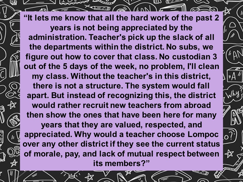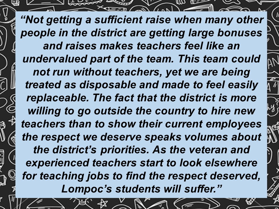 There are many things to address in his hit piece, including the misleading characterization of how district dollars are spent on employees and his fuzzy math, in which he appears to be asking why our district’s elementary and middle school students are not enrolled in AP classes. But the most insulting part of it by far was how he attempted to diminish and denigrate the efforts of our extraordinary teachers in the Lompoc Unified School District.
