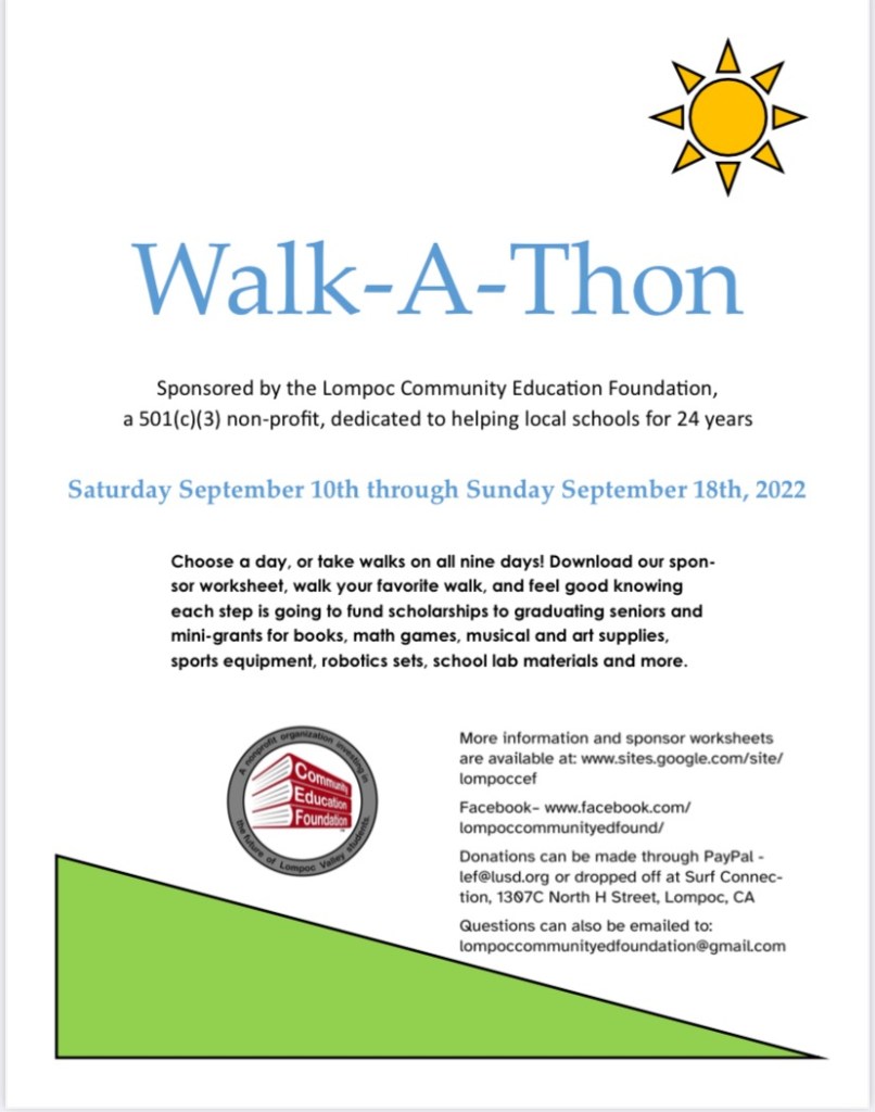 The Lompoc Community Education Foundation is holding a Walk-A-Thon fundraiser that starts TODAY to fund scholarships for seniors and mini-grants for teachers in our local schools. What a great way to get some exercise and support a good cause in the process!