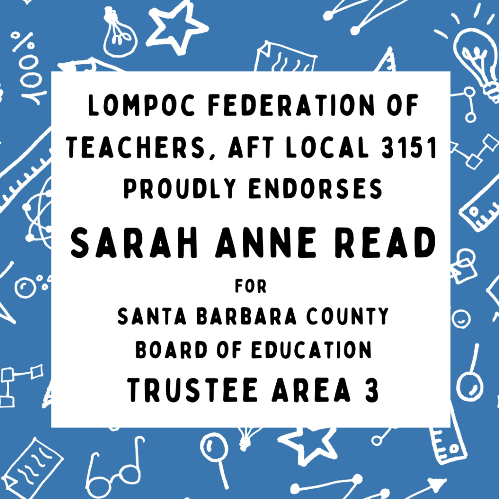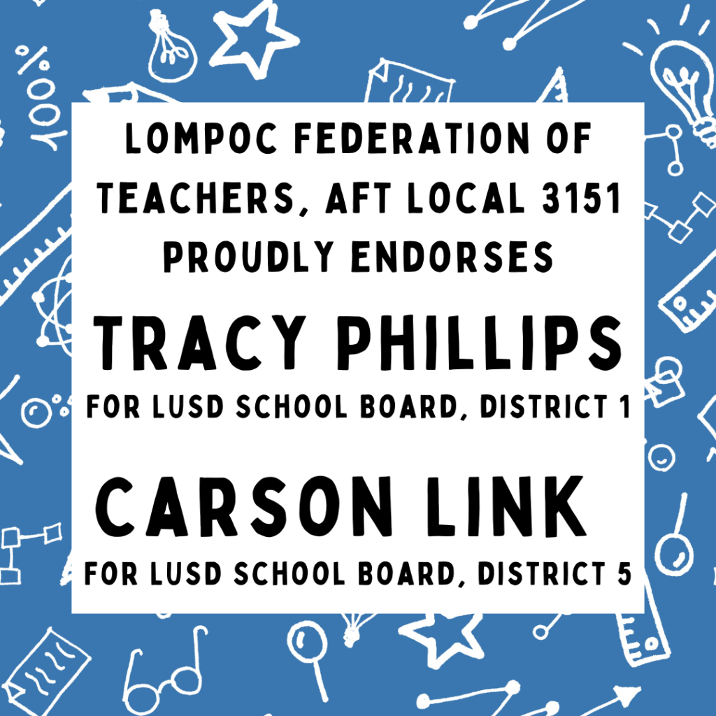 Again, THANK YOU, to everyone who provided input on how our negotiating team should proceed in contract negotiations. Each and every one of you is so valuable to this school district, and we know how hard you work for Lompoc’s students and how much harder that work has been this year. Please know that the LFT negotiating team is so proud to represent all of you at the bargaining table and to fight on your behalf.