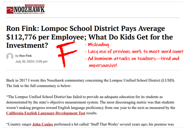 How disappointing (and frankly, unoriginal) that columnist Ron Fink has once again chosen to utilize his platform to bash the hard-working employees of the Lompoc Unified School District.